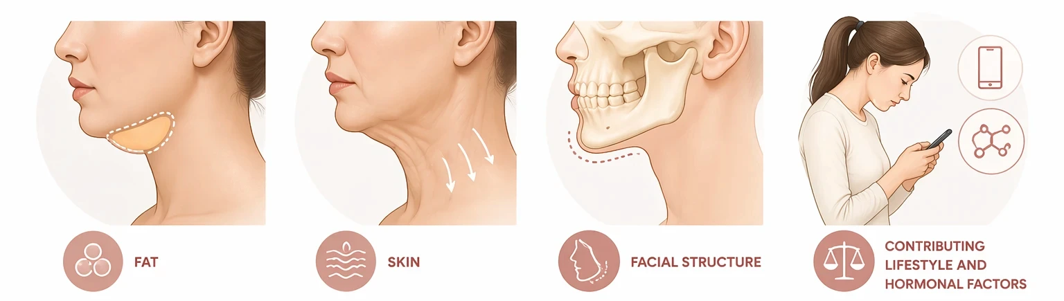 Submental fullness is often assumed to be purely a result of excess weight, but the picture is more complex. Three distinct factors can contribute, individually or in combination.